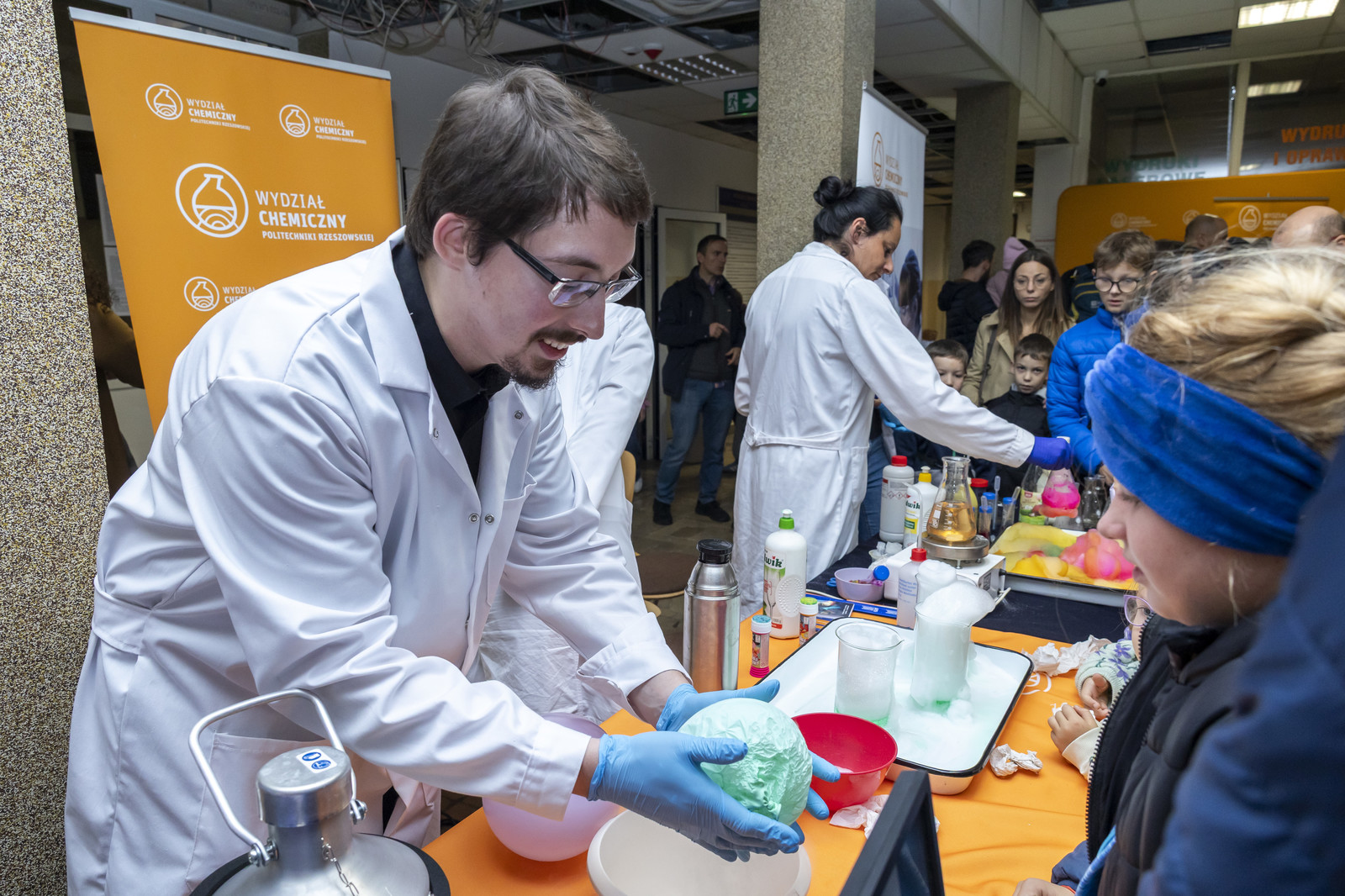 - na Wydziale Chemicznym – pokazy „Czy na Wydziale Chemicznym straszy? – znikający duch”, „Chemiczne zwierzęta – wąż i kameleon”, „Wstrząśnięty błękit”, „Chemiczna lawa”, Techniki in vitro i in vivo w badaniach biotechnologicznych (Koło Naukowe Insert), Lewitacja akustyczna, Lasery i fluorescencja Biomodelowanie 3D z użyciem gestów rąk (Koło Naukowe Ab Initio), Kolorowa ekstrakcja ATPE, Wpływ temperatury na właściwości materiałów, Stwórz swój eliksir (Koło Naukowe IPSUM), Świat polimerami drukowany (Koło Naukowe Przetwórcy) Laboratorium piwowara – pokaz warzenia piwa (Koło Naukowe PRzy Piwie),