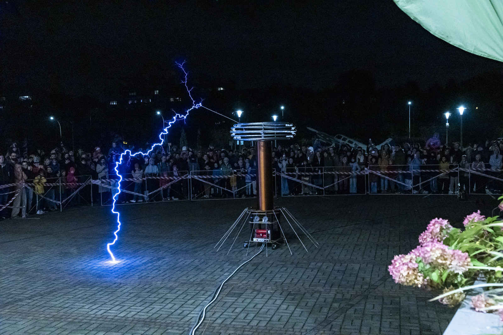 Najbardziej wyczekiwaną atrakcją Nocnych Spotkań z Nauką był „Teatr wysokich napięć”. Do tego widowiskowego spektaklu wykorzystany został jeden z największych w swojej klasie transformatorów Tesli. Kilkumetrowe wyładowania, które w rytm muzyki rozświetlały mrok, wzbudziły zachwyt widowni.