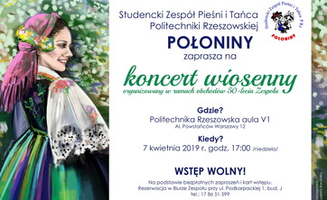 Koncert wiosenny odbędzie się w dniu 7 kwietnia 2019 r. o godz. 17:00 w auli V-1 Politechniki Rzeszowskiej przy ul. Powstańców Warszawy 12.