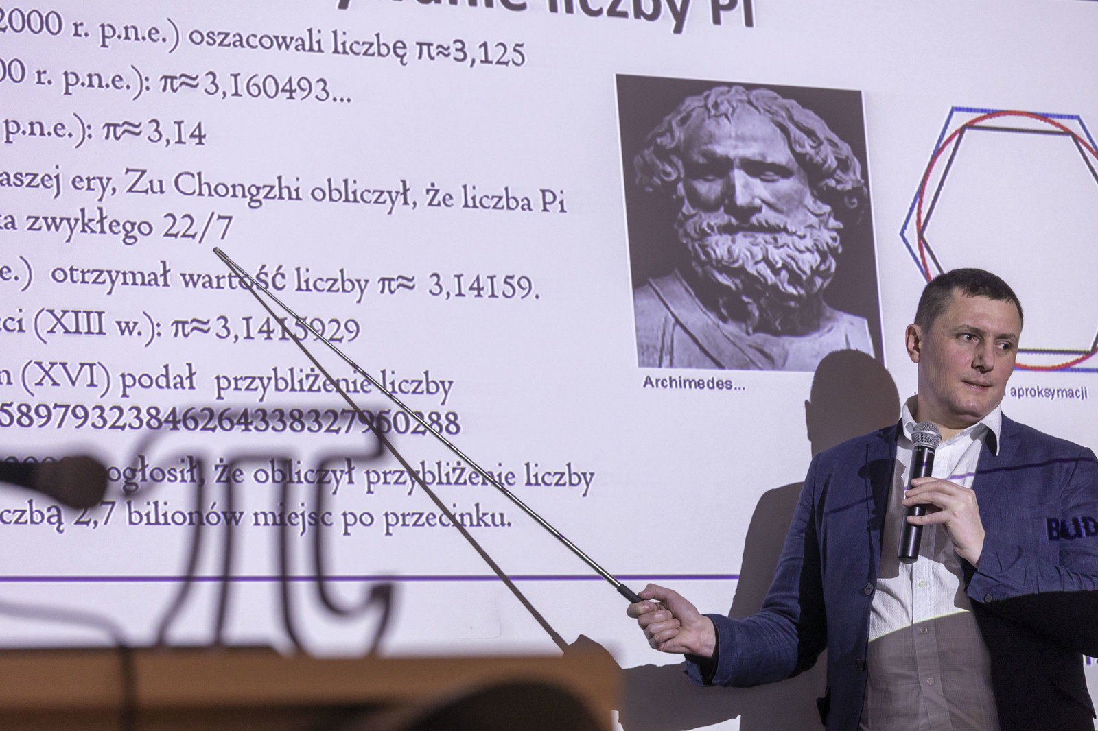 Wykład inauguracyjny pt. „Stała Archimedesa, czyli podziwu godna liczba π” zaprezentował dr Krzysztof Piejko. Jedną z ciekawostek przytoczonych podczas wykładu była informacja dotycząca jednego ze sławnych miłośników liczby Pi matematyka Ludolpha van Ceulen, który żył na przełomie XVI i XVII w. Na obliczaniu kolejnych cyfr rozwinięcia liczby Pi spędził on niemal całe życie. Wynikiem jego pracy jest pierwsze 35 cyfr rozwinięcia liczby Pi, które umieszczono na jego nagrobku. Na pamiątkę fascynacji tego matematyka liczbę Pi nazywa się czasem „ludolfiną”. Obecnie znanych jest ponad 60 bilionów pierwszych miejsc po przecinku liczby Pi.