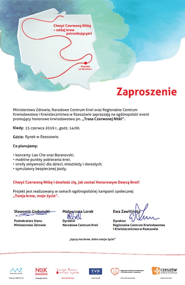 W tym roku „Trasa Czerwonej Nitki” zawędruje również do stolicy Podkarpacia. 15 czerwca 2019 r. o godzinie 14:00 na Rynku w Rzeszowie odbędzie się kolejna edycja corocznego święta krwiodawstwa.