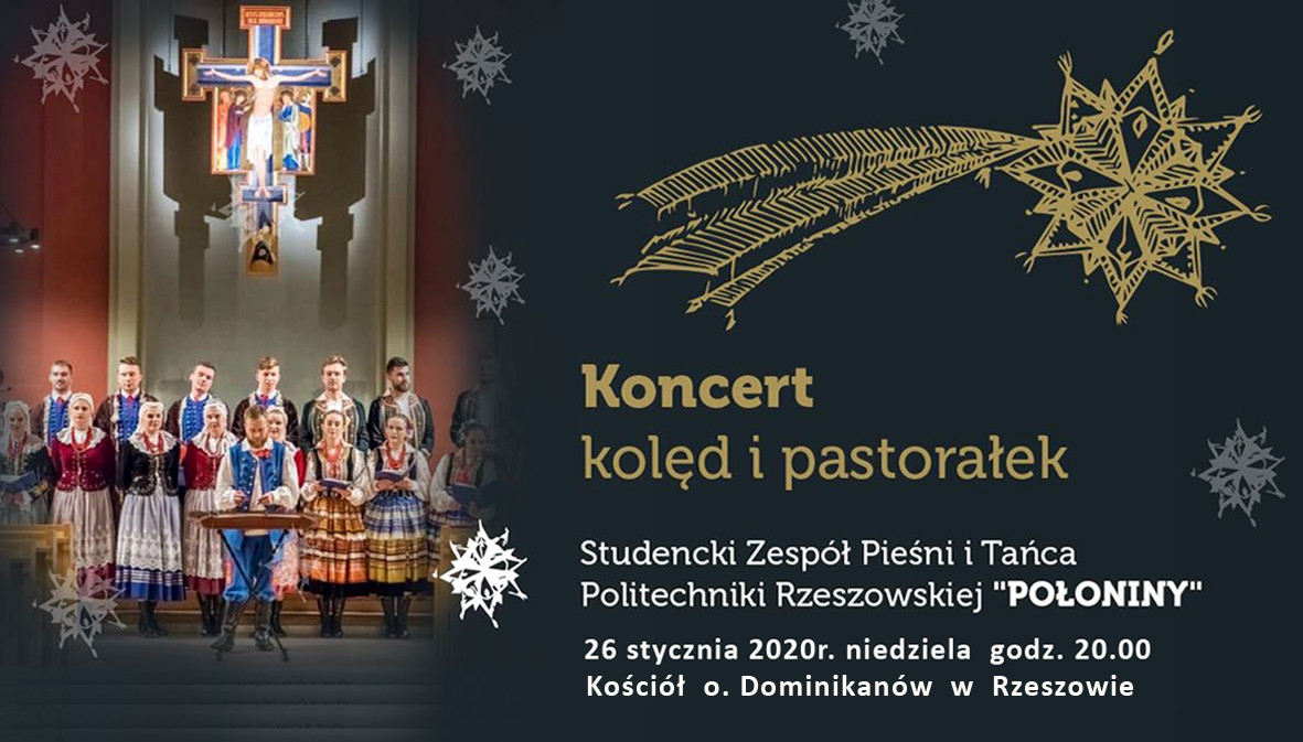 Studencki Zespół Pieśni i Tańca Politechniki Rzeszowskiej „Połoniny” zaprasza na koncert kolęd i pastorałek w najbliższą niedzielę tj. 26 stycznia o godzinie 20:00 (po Mszy św. o godz. 19:00) w kościele o. Dominikanów w Rzeszowie.